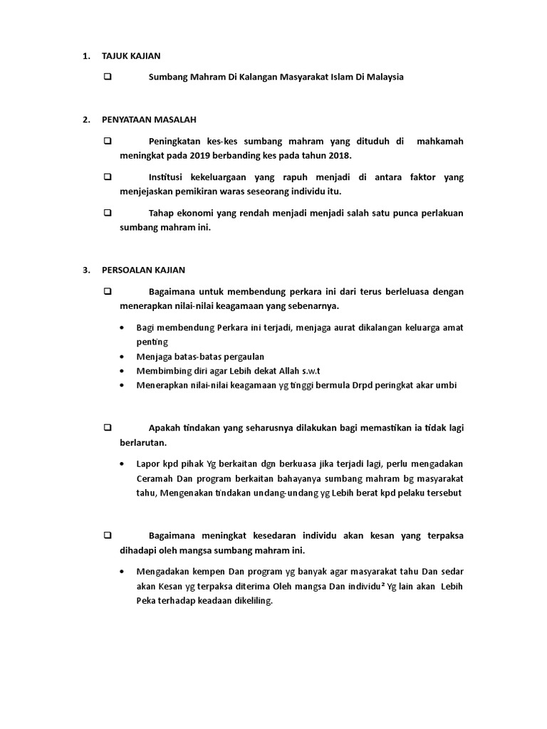 Contoh penyataan masalah Untuk memudahkan pemahaman contoh-contoh ini akan dibahagikan kepada struktur yang telah dijelaskan sebelumnya pemerhatian data dan fakta mencari masalah persoalan kajian. Sumbang mahram adalah hubungan jenis antara mereka yang mempunyai tali persaudaraan dan perkahwinan antara mereka adalah tidak sah di sisi undang-undang atau dilarang oleh adat resam. Azizah Othman Azelin Aziz Fakulti Pengurusan Perniagaan Universiti Utara Malaysia Tel04-92841199285236 Faks.